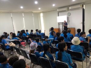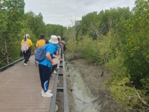 วันที่ 6 กันยายน พ.ศ. 2567 โรงเรียนบีคอนเฮาส์แย้มสอาดหัวหิน อำเภอหัวหิน จังหวัดประจวบคีรีขันธ์ ได้นำนักเรียนชั้นประถมศึกษาปีที่ 6 พร้อมคณะครู เข้าศึกษาดูงาน จำนวน 49 คน ซึ่งทางโครงการฯ ได้ให้ความรู้เกี่ยวกับการบำบัดน้ำเสียและการกำจัดขยะชุมชน โดยใช้หลักของธรรมชาติช่วยธรรมชาติตามแนวพระราชดำริ โดยรับฟังการบรรยายจากเจ้าหน้าที่ประชาสัมพันธ์/นักวิชาการสิ่งแวดล้อม รับชมวีดิทัศน์ในห้องประชุม นั่งรถรางชมพื้นที่การดำเนินงานของโครงการ พร้อมศึกษาระบบนิเวศป่าชายเลนธรรมชาติเส้นทาง “มัจฉาบาทา”