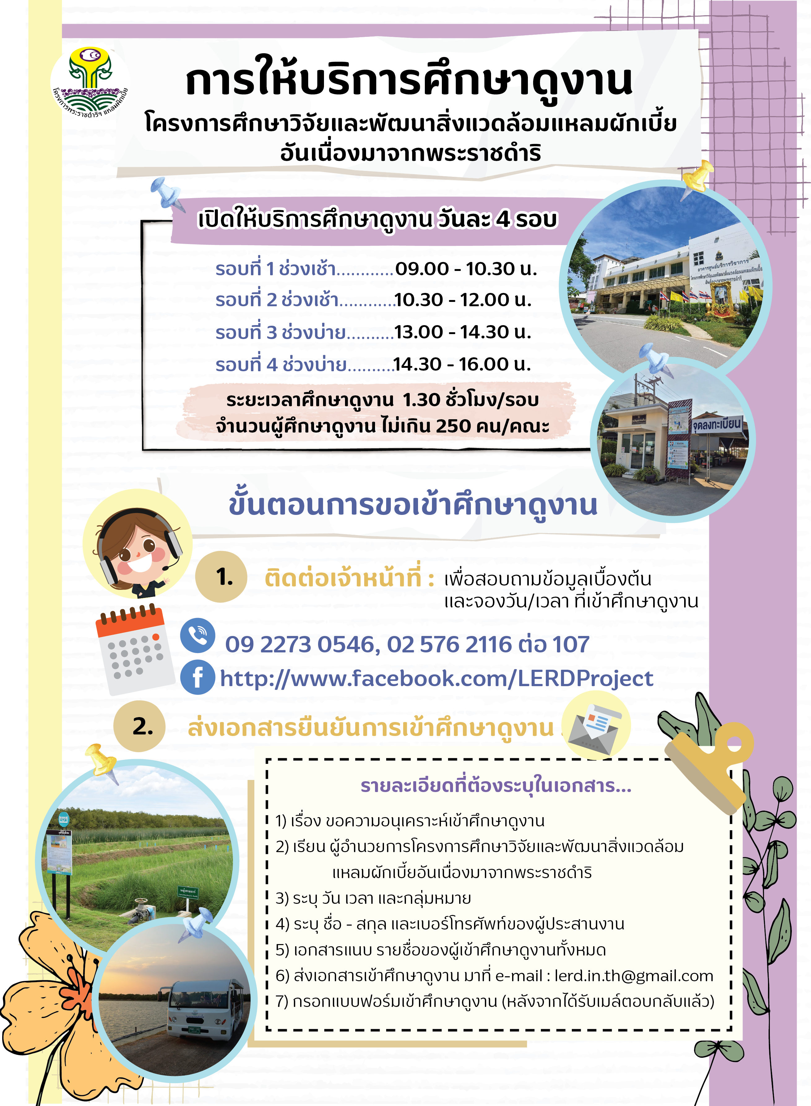 โดยสามารถจองวันเวลาดูงานได้ในเว็บไซต์หรือสอบถามข้อมูลเพิ่มเติมที่ฝ่ายบริการศึกษาดูงานได้ที่เบอร์โทรศัพท์ : 092-2730546  อีเมล : [email protected] หรือดาวโหลดเอกสารและขั้นตอนการให้บริการได้ตามลิงค์